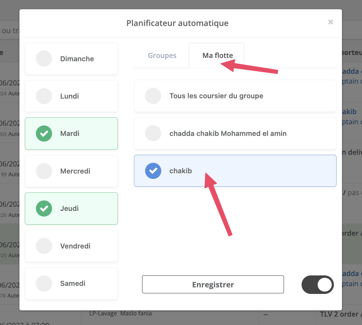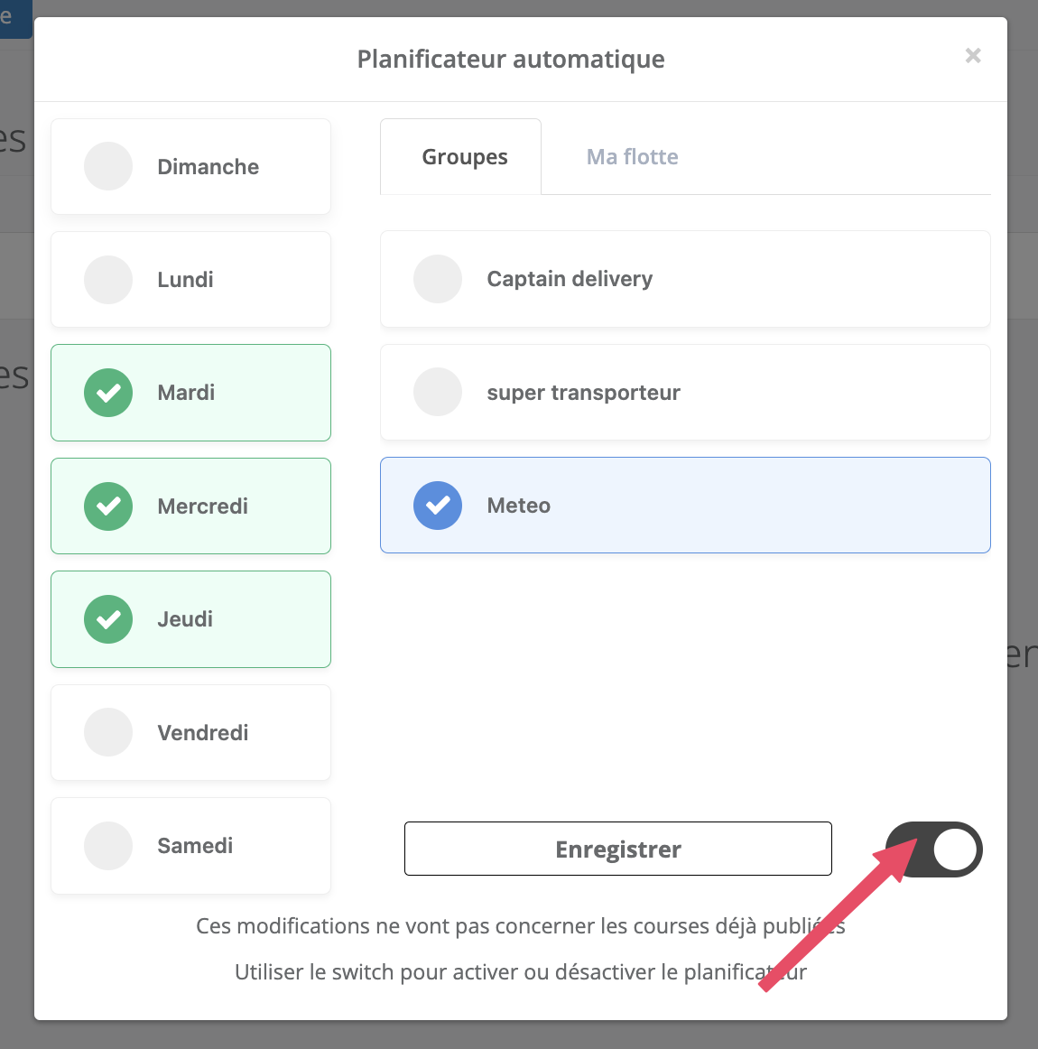 Il vous suffit de cliquer sur le planificateur automatique et d’ajuster les jours, le groupe ou le chauffeur.