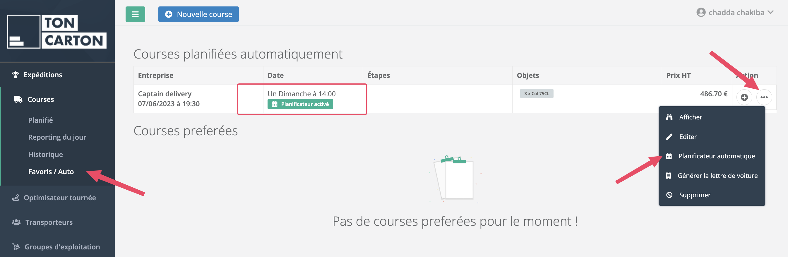 Vous avez des courses récurrentes, par exemple tous les lundis, et vous souhaitez les programmer avec Toncarton ? Rien de plus simple. Il vous suffit de poster votre course, de cliquer sur le bouton (…) et de sélectionner "Créer une planification".