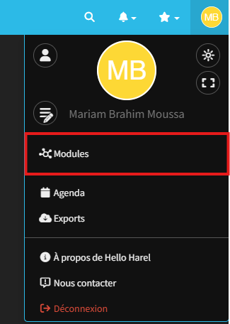 Afin d’installer le module Toncarton sur votre espace Hello Harel, rendez-vous dans votre compte et cliquez sur votre profil, puis sur “Modules”.