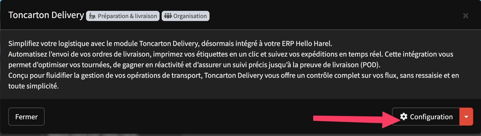 Désormais, Toncarton est intégré à Hello Harel pour faire passer votre logistique au niveau supérieur. En combinant le TMS nouvelle génération de Toncarton et l’ERP complet de Hello Harel, vous bénéficiez d’un pilotage fluide, automatisé et optimisé de vos flux transport, directement depuis votre environnement de gestion.