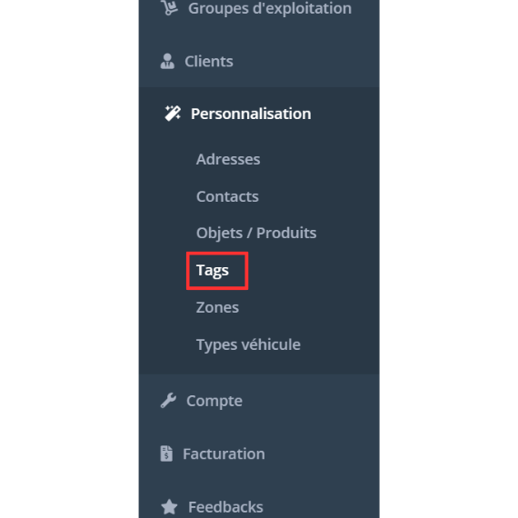 Pour créer vos tags, il vous suffit de vous rendre sur votre espace Toncarton, puis de cliquer sur "Personnalisation" et sélectionner "Tags" dans le menu de gauche.