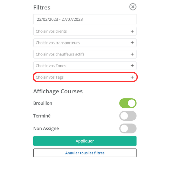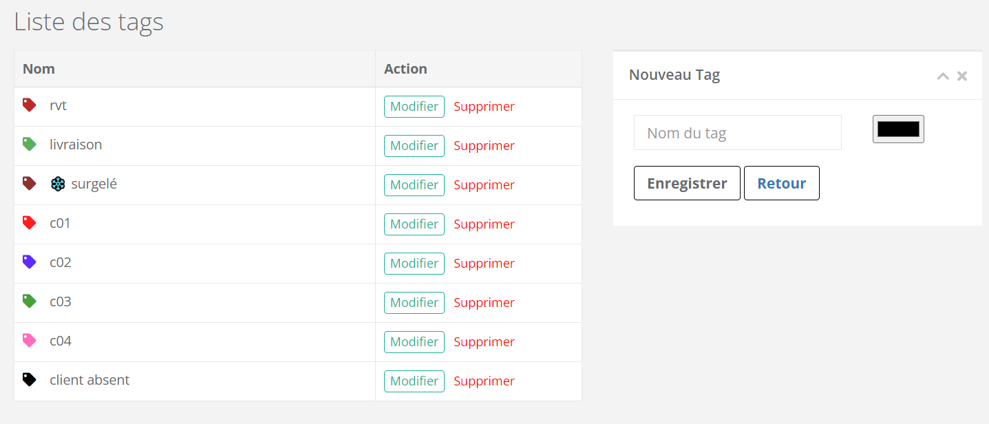 Chaque tag correspond à une typologie de course (livraison, retour, ravitaillement, ramassage, échec, client absent, colis endommagé, etc.) que vous pouvez définir en fonction de votre activité et de vos besoins. L'affectation de tags à chaque course vous permet de maintenir un tableau de bord clair et organisé.