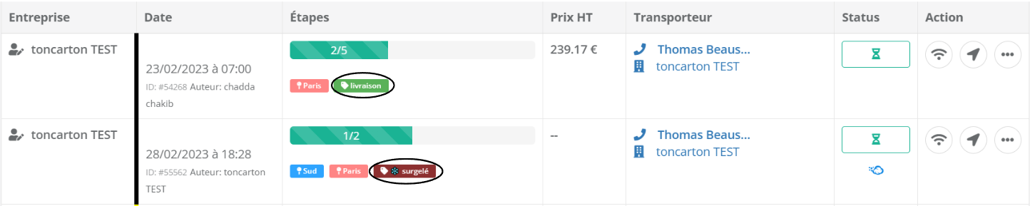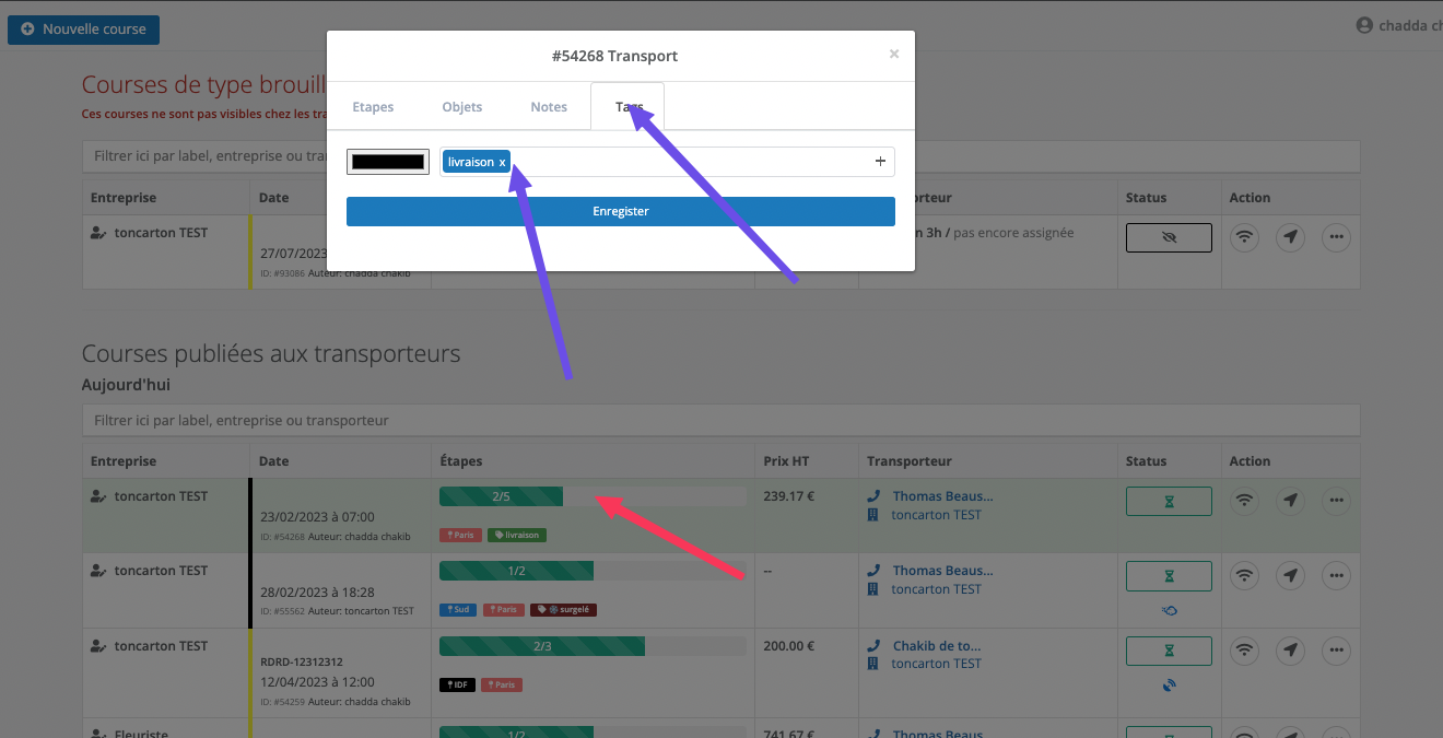 Sur les courses, les tags sont affichés dans la colonne « Étape », avec la couleur que vous leur avez attribuée lors de leur création.