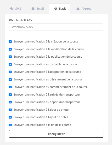 Une fois le webhook collé, cliquez sur "Enregistrer" et tout est prêt. Vous recevrez désormais tous les événements en temps réel sur votre Slack ! \ \ Pour tester votre intégration, créez ou éditez une course, et vous verrez l'événement apparaître directement dans votre nouvelle room Slack. \ \ Vous pouvez également personnaliser les événements que vous souhaitez recevoir sur Slack dans la section Notifications.
